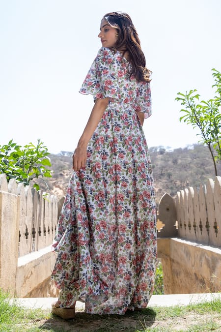 Dove white draped dress with floral printed motifs and cutout at the waist.