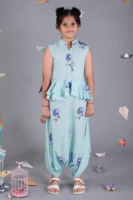 Buy_Pasha India_Blue Polyester Embroidery Floral Print Peplum Dhoti Jumpsuit _at_Aza_Fashions