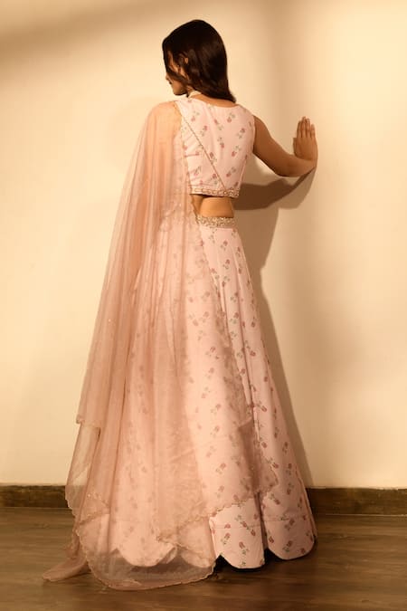 Rosy pink kalidar lehenga featuring floral printed motifs and sequin, pearl, and cutdana embroidery on the waistband. Accompanied by an embroidered V neck sleeveless padded blouse and a sheer scallop border dupatta.