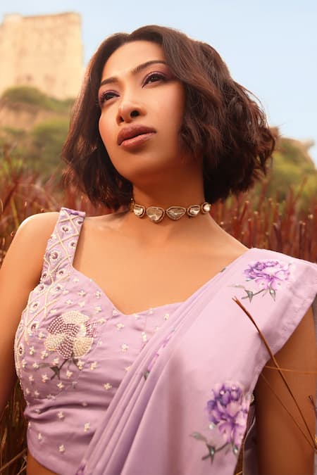 Purple floral print pant saree set featuring a sweetheart neckline embroidered blouse. Paired with a pleated detachable drape and coordinating straight pants.
