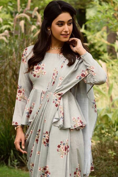 Laurel peplum style saree with all-over floral printed motifs and attached pallu. Comes with pants.