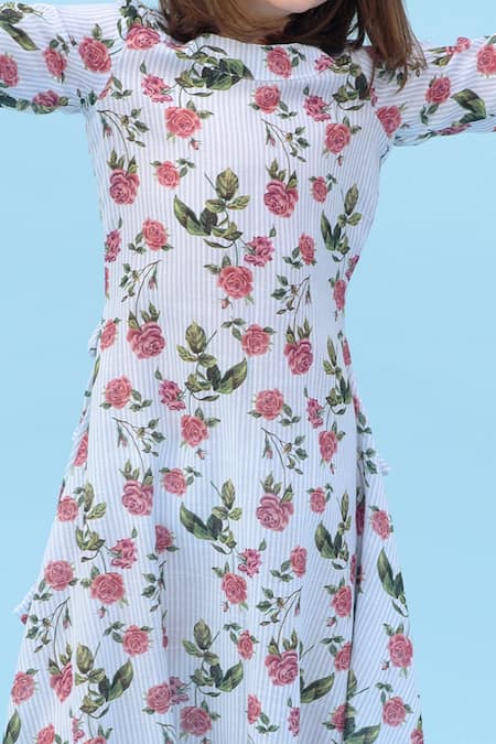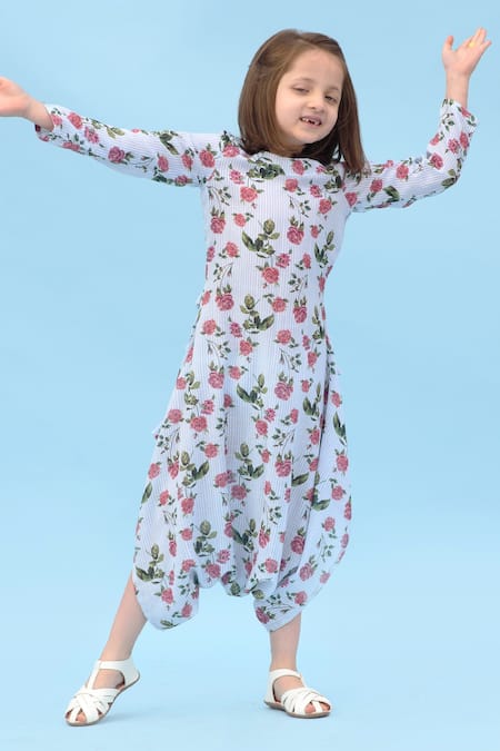 Iceberg blue jumpsuit featuring an all-over floral and striped print with a round neckline and three-quarter sleeves