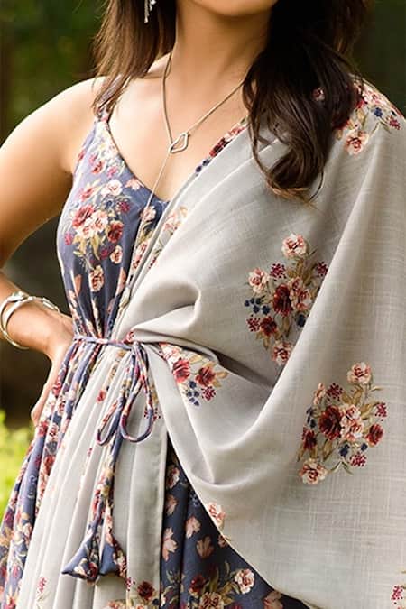Buy_Pasha India_Blue Linen Floral Print V Neck Jumpsuit With Drape _at_Aza_Fashions