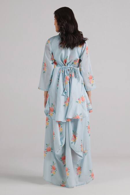 Baby blue kurta dress featuring floral pattern with drape detailing