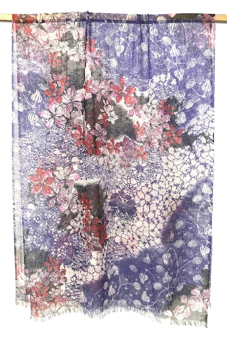 Purple scarf made from silk cashmere featuring an all-over abstract floral motif pattern