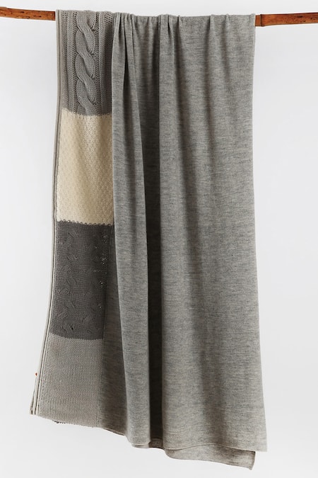 Grey cashmere scarf featuring hand knit cables and textured sides