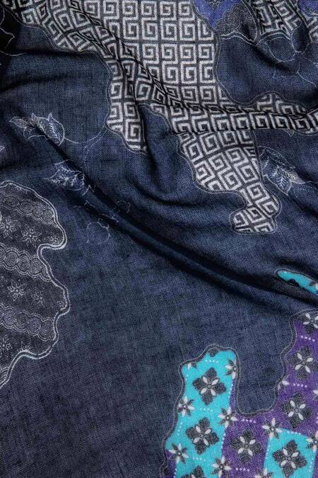 Navy blue scarf featuring an all-over abstract motif print and a frayed border
