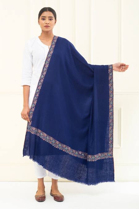 Blue Embroidered Floral Jaal Border Pashmina Shawl