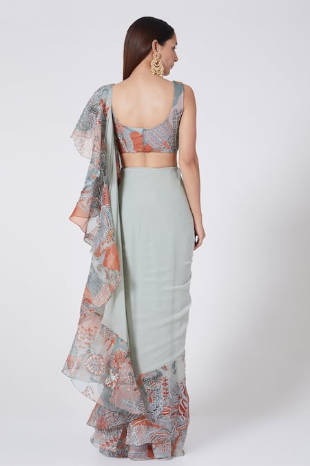 Blue ruffle saree with floral print and embellishment. Comes with sleeveless blouse.