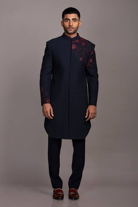 Navy blue sherwani featuring floral and thread embroidery with a mandarin collar. Paired with a matching pant, crafted from shimmer glitter polinosic fabric.