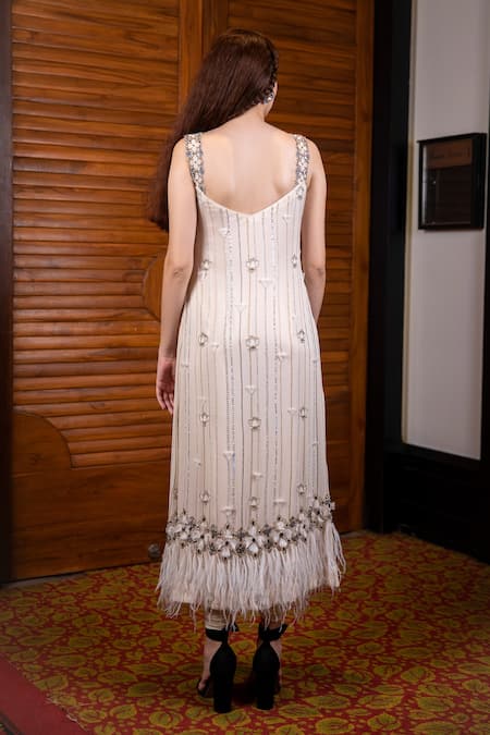 Ivory strappy kurta with patchworked buttis in beads, silver stones & feather hem detail. Paired with churidar.