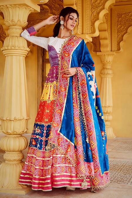 Multicolored anarkali with patola print & gota embroidery. Paired with printed dupatta.