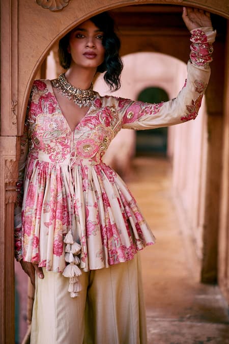 Ivory peplum top featuring blooming floral print with zardozi and sequin embroidery. Paired with a coordinating palazzo made from cotton silk.