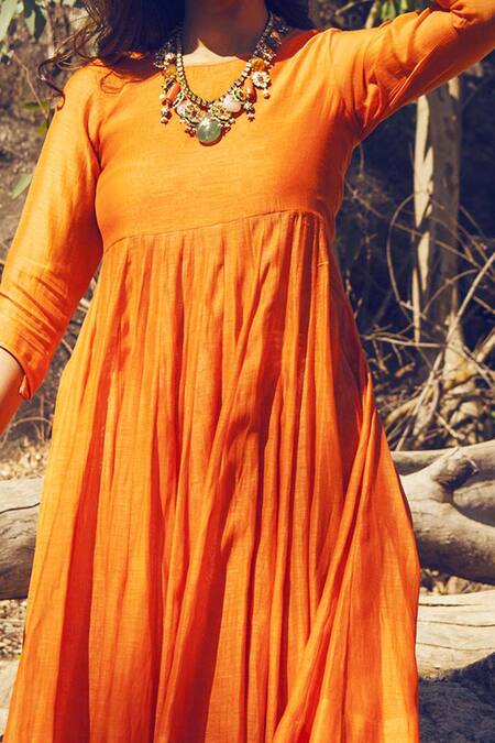 Orange Anarkali And Pant Mul Cotton Dupatta Chanderi Round Set