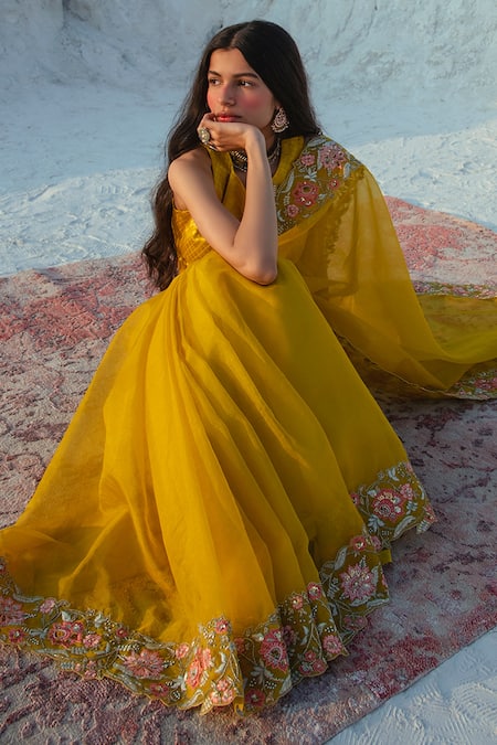 Mustard yellow saree with floral embroidered borders. Comes with blouse.