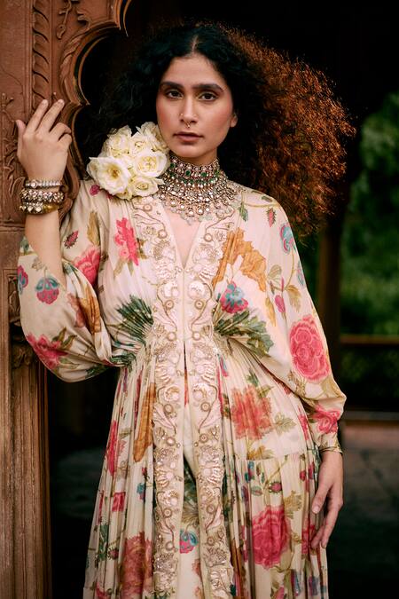 Multicolor kaftan featuring flip bird print and zardozi embroidered placket in floral pattern. Paired with a matching pant with side zip closure.