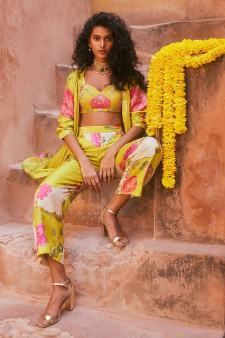 Lime yellow habutai jacket featuring floral print and three quarter sleeves. Paired with a sequins and thread embroidered blouse and matching trouser.