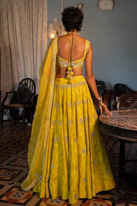Lime yellow lehenga made of Russian jacquard featuring silver zari floral motifs. Paired with a padded blouse in chiniya silk and a tissue dupatta with zari embroidered borders.