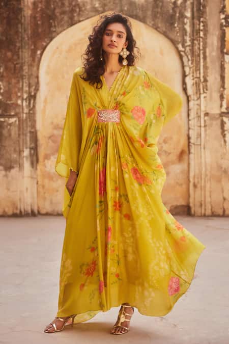 Lime yellow kaftan featuring floral print with sequins and beaded embroidery. Paired with a shantoon inner for added comfort.
