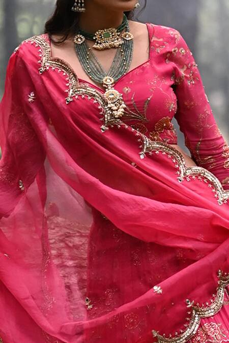 Rani pink tiered lehenga with floral print, sequins, dabka work and moti hand embroidery. Comes with embroidered blouse and net dupatta.