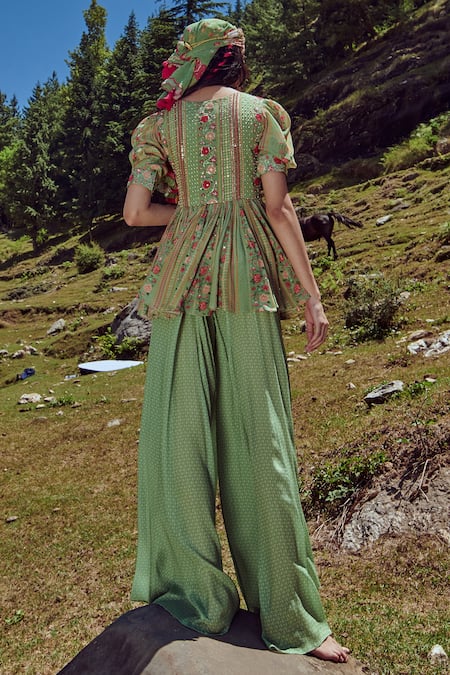 Fern green peplum top with floral printed motifs, pleats on the yoke and slit in front. Comes with solid palazzo.