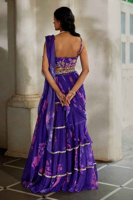 A Grape Jelly Purple pre-stitched saree crafted from printed chiffon, featuring delicate floral prints and tiered layers. Each layer and the pallu are adorned with embroidered borders. Paired with a hand-embroidered Gokul Chiniya blouse and a hand-embroidered belt.