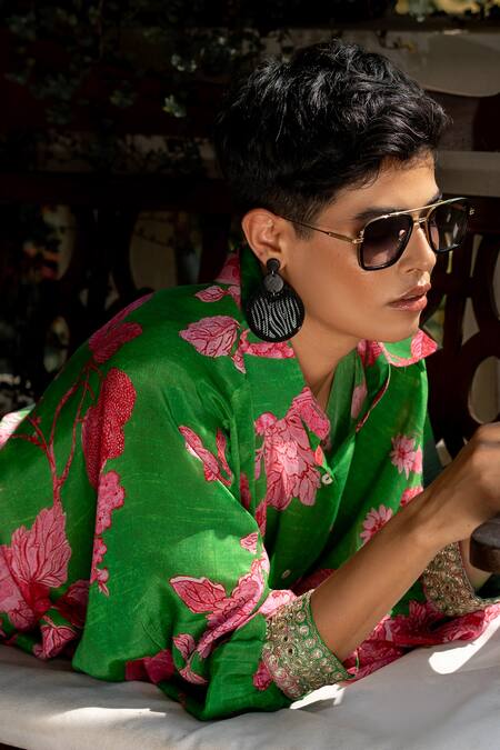 Green kimono sleeve shirt featuring floral prints, sequins, zari, mirror and resham embroidered cuffs. Paired with accordion pleated pant in a matching design.