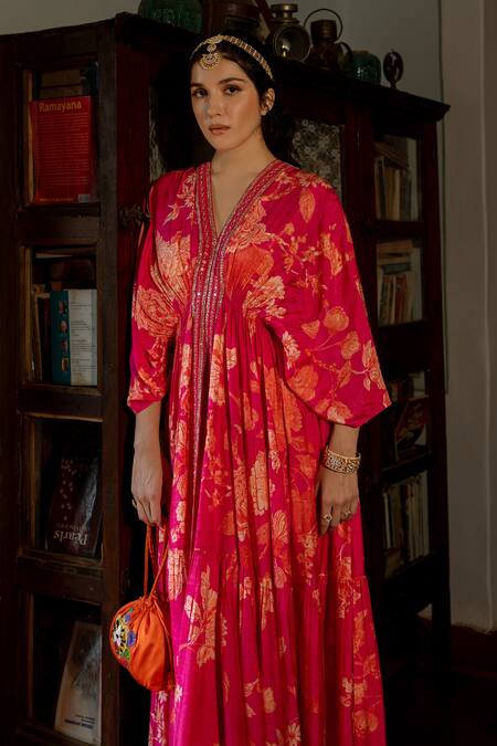 Pink kaftan featuring floral jaal print, V-neck, and dropped batwing sleeves. Paired with straight cut printed pencil pant with side zip closure.