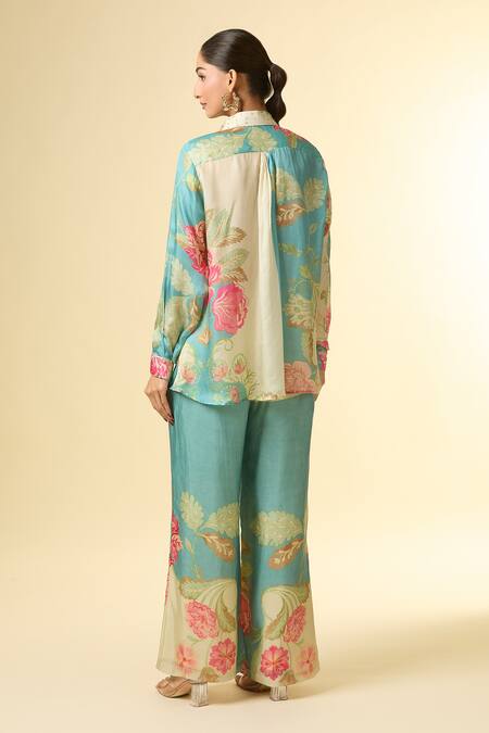Blue Silk Beads, Embroidery Collared Flower Bloom Print Shirt And Pant Set