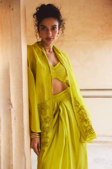 Lime yellow cape featuring floral embroidery with a flowing design. Paired with a padded pleated blouse and a skirt with slit detailing.