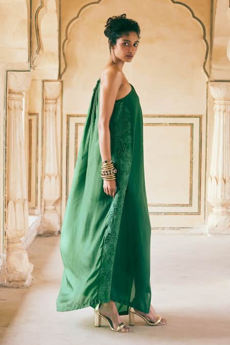 Emerald green one shoulder maxi dress featuring floral cutwork embroidered panel