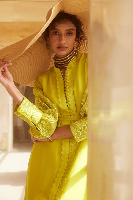 Lime yellow vintage maxi dress featuring tonal floral embroidery and slit detailing
