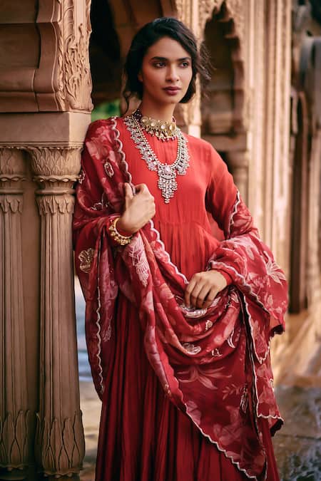Scallop trims on the dupatta, Floral motif embroidery on the anarkali, Forty kali design for added flair