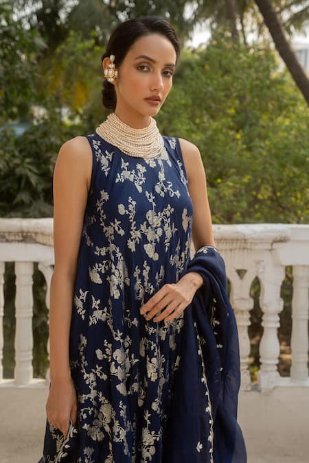 Midnight blue sleeveless flared anarkali featuring all over Gul print. Paired with a matching straight pant and a scallop border bloom embroidered dupatta.