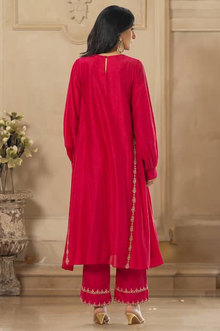 Rani pink chiniya silk kurta featuring hand embroidered anar motifs, mirror, and zari work. Paired with matching pant featuring an elasticated waistband.