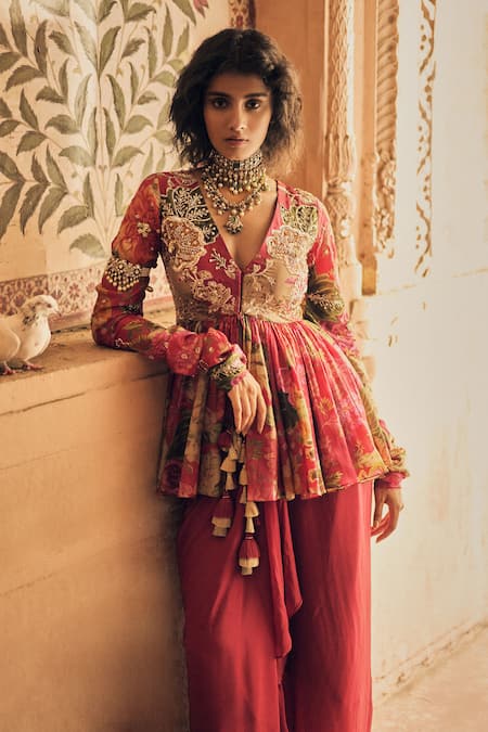 Red peplum tunic featuring a V neck, churidar sleeves, and floral prints with sequin and cutdana embroidery. Paired with a draped skirt with side zip and clip closure.