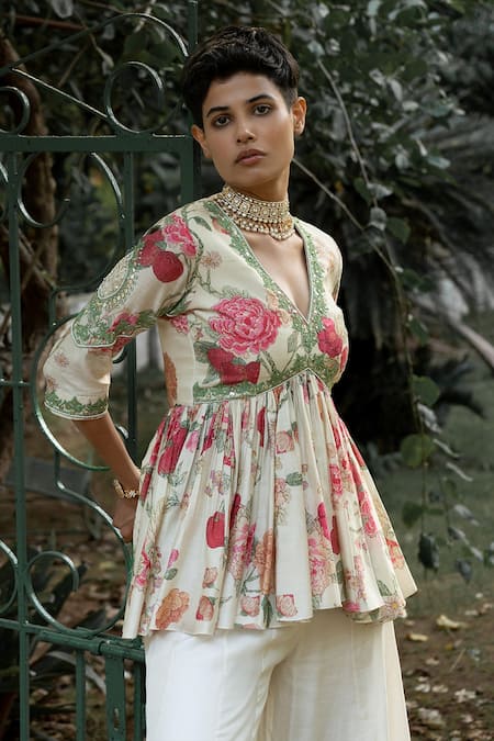 Off white cotton silk peplum featuring sage green resham dori work with petal leaves motif, highlighted with sequins, moti, cutdana, thread work butta on sleeves and hand embroidered with gold accents. Comes with a palazzo featuring a pleated flare and tassel ornamentation.