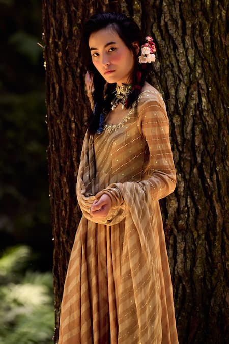Beige anarkali with leheriya print and embroidery on the yoke. Comes with dupatta.