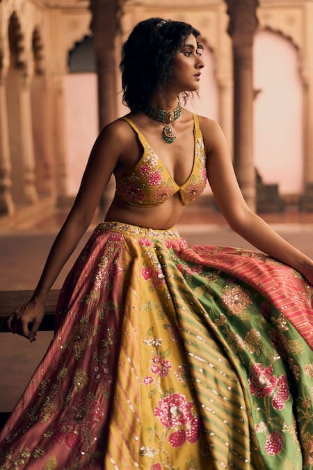Multicolor lehenga featuring leheriya and floral prints with intricate sequin, cutdana, zari, and resham embroidery. Paired with a padded blouse and a Banarasi organza dupatta.
