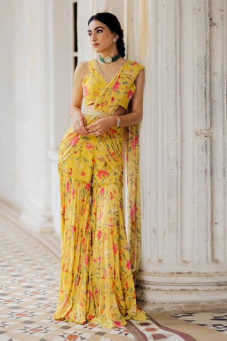 Sunshine yellow pre-stitched sharara pant saree with all-over multi-color floral motif print. Comes with placement embroidered blouse.