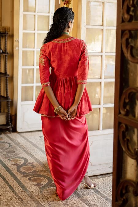 Red peplum kurta featuring a V neck, three quarter sleeves, and intricate floral embellishments. Paired with a satin cowl draped skirt with a side concealed zip closure.