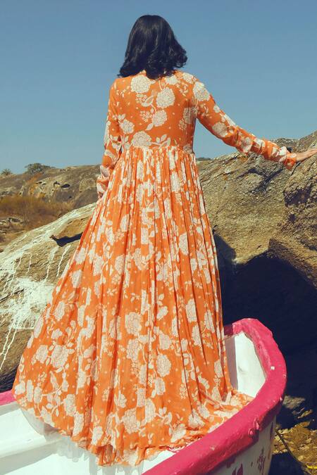 Orange Organza, Georgette, Cotton Silk Sweetheart Printed Jacket Lehenga Set