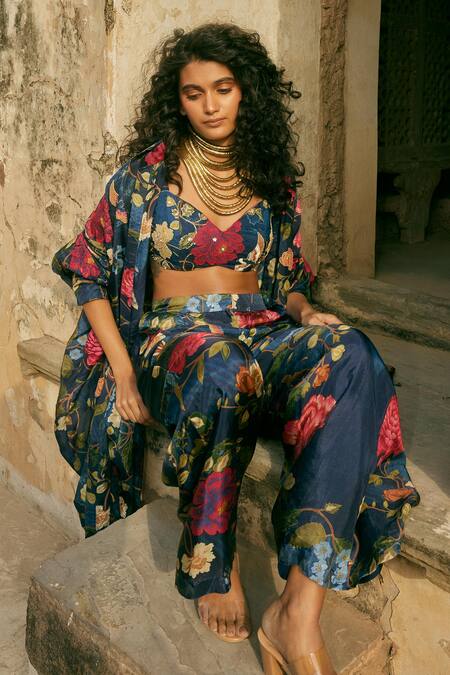 Blue floral printed organza jacket with sequins and thread embroidery. Paired with a habutai blouse and trouser.