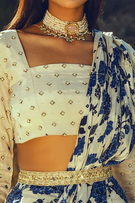 Off white pre-stitched saree with floral, bird printed motifs & scallop border. Paired with embroidered blouse & embroidered belt.