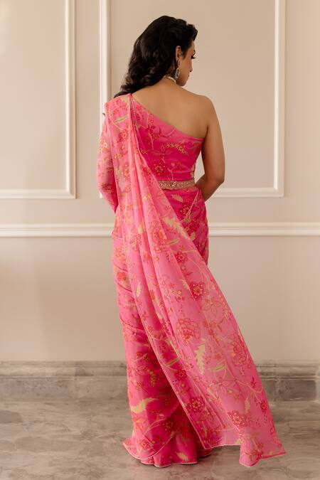 Fuchsia pink pre-draped saree with chintz printed motifs. Paired with one shoulder crop top style blouse with gathered sleeve. Comes with cutdana embellished belt.