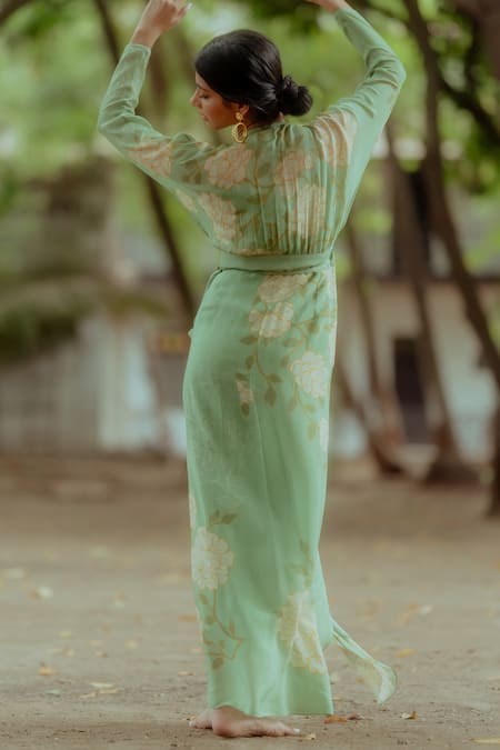 Green Pure Crepe Rose Print V Neck Wrap Dress With Belt