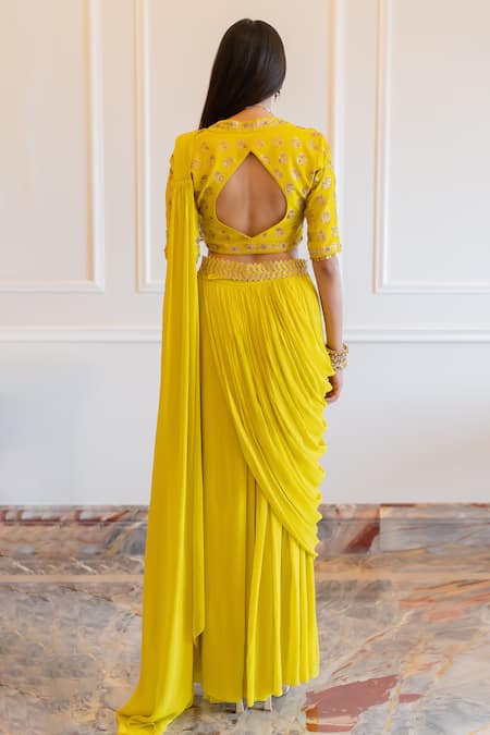 Lime yellow georgette pre-stitched saree featuring pleats and an attached lining. Paired with a tussar silk padded blouse adorned with hand-embroidered floral motifs, sequins, and zari, along with a coordinating belt.