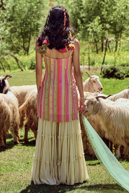 Multicolor striped kurta with mirror work and thread embroidery. Comes with sharara and green dupatta.