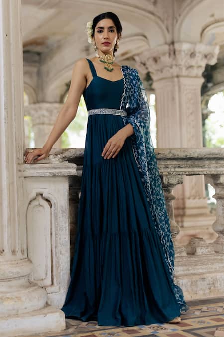 Teal blue tiered anarkali with gathered detail paired with embellished belt & scallop border dupatta.