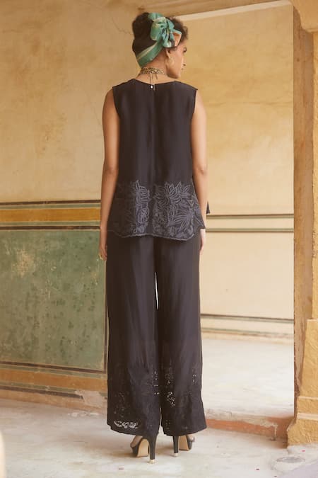 Black Silk Organza Embroidery V-neck Tonal Cami Top With Trouser